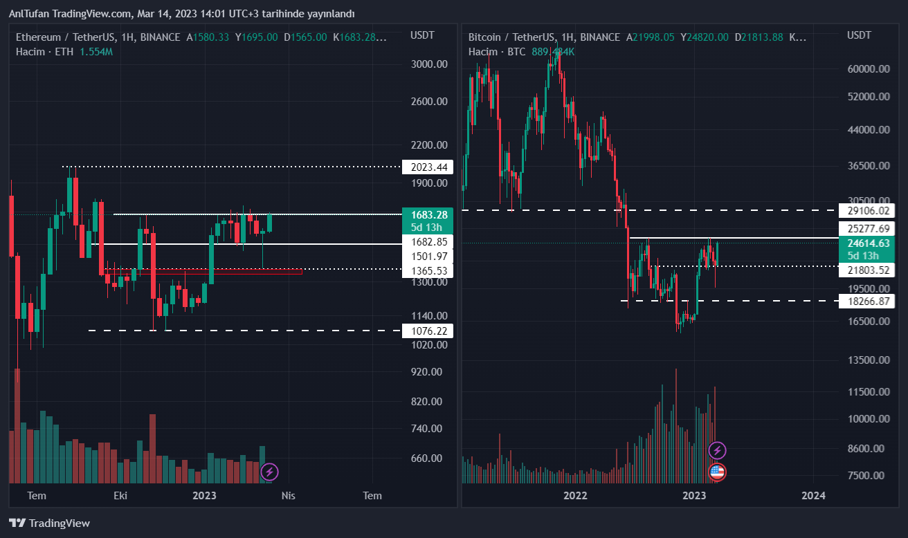 Her ne kadar son günlerde Bitcoin ve Ethereum ciddi yükselişler yaşamış olsa da, halen kritik direnç seviyelerini aşamadıkları görülüyor. BTC’nin 25.200 doları, ETH‘nin ise 1.700 dolar direncini aşması, durumları değiştirebilir.