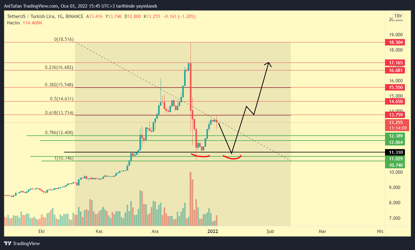 Yayın saati itibariyle 13.25 Türk Lirası seviyelerinde bulunan USDT, günlük grafik de tekrardan 11.30 seviyelerinde bir dip yapması durumunda, w formasyonu oluşturmuş olacak.
