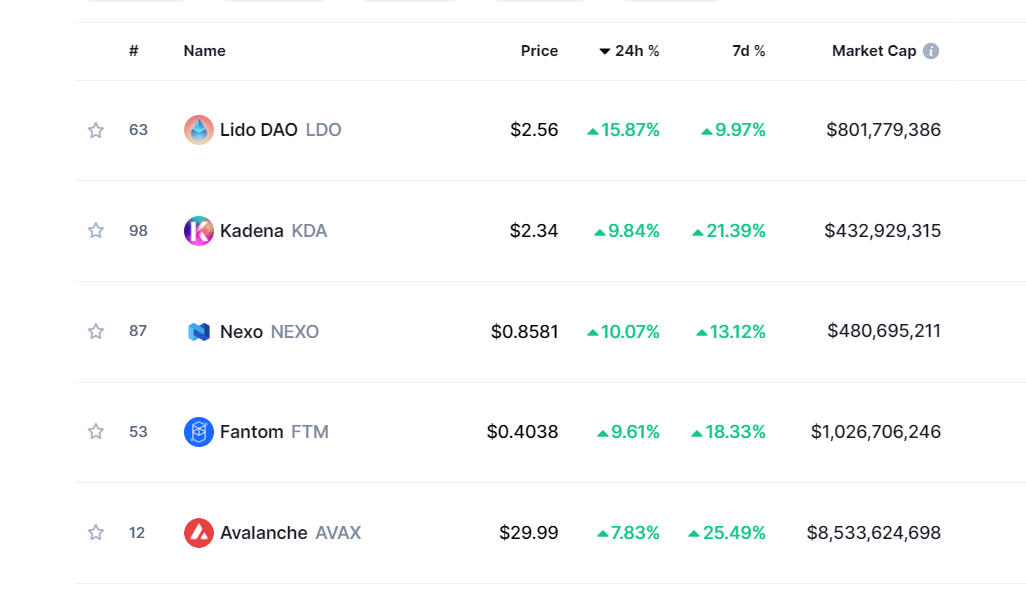 Bitcoin‘in 24 bin doları aştığı son dakikalarda ise CoinMarketCap verilerine göre, en çok Lido DAO yükseliş yaşamış durumda. Lido DAO‘nun ardından sonra ise sırasıyla Kadena, NEXO, Fantom ve Avalanche geliyor