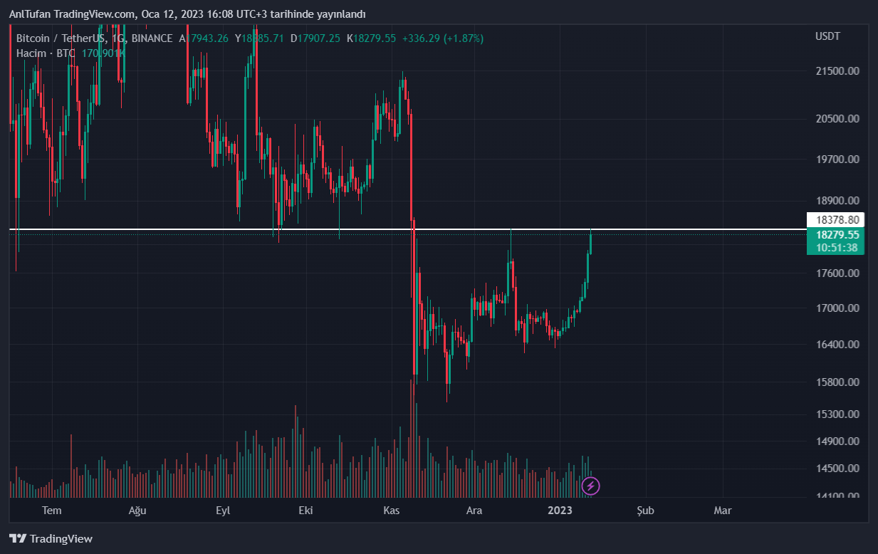 Son dakikalara baktığımızda lider kripto para birimi Bitcoin’in (BTC) 18.280 dolar seviyelerinde yer aldığı görülüyor. 14 Aralık tarihindeki 18.400 dolar zirvesini zorlamaya devam eden BTC, enflasyon verisine göre bir kırılım gerçekleştirebilir.