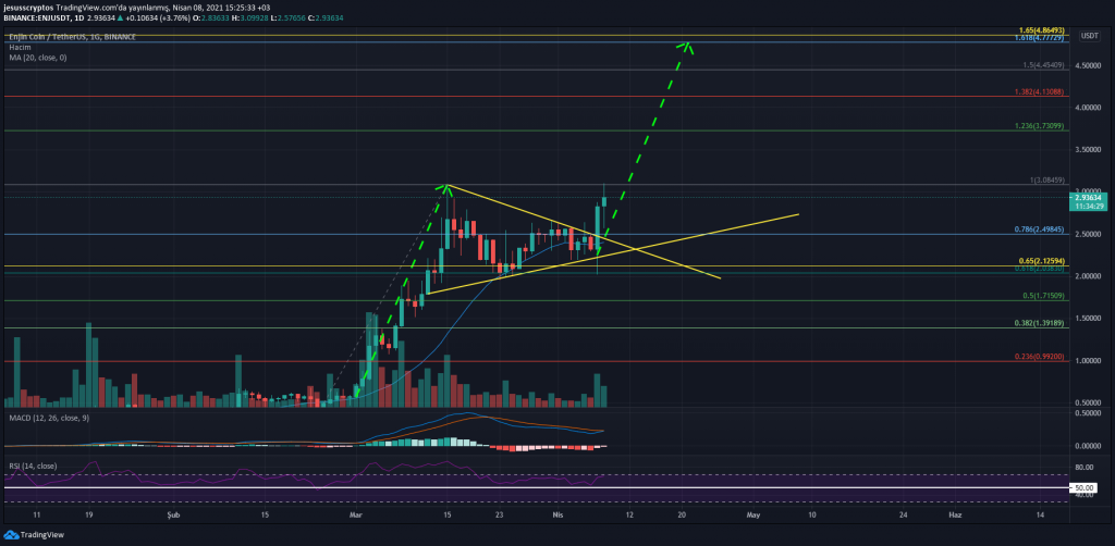Mart ayının başlangıcından ortasına kadar 15 günlük süreçte 3 dolarlık zirveye %448’lik yükselişle ulaşan ve yeni ATH yapan ENJ, bir süre 2 dolar seviyelerine gerilemiş olsa da bugün yeniden 3 dolarlık psikolojik seviyeyi deniyor.