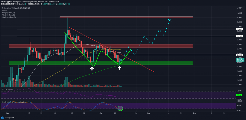 Temel anlamda oldukça iyi şekilde ilerleyen ENJ için teknik anlamda da bir düşen trendi kırmaya hazırlandığı söylenebilir. Nisan ayındaki zirveden bu yana gelen bu düşüş trendinde fiyatın önemli destek alanı olan 1.88 – 2.05 dolar aralığı üzerinde yer aldığı ve giderek sıkıştığı görülüyor.