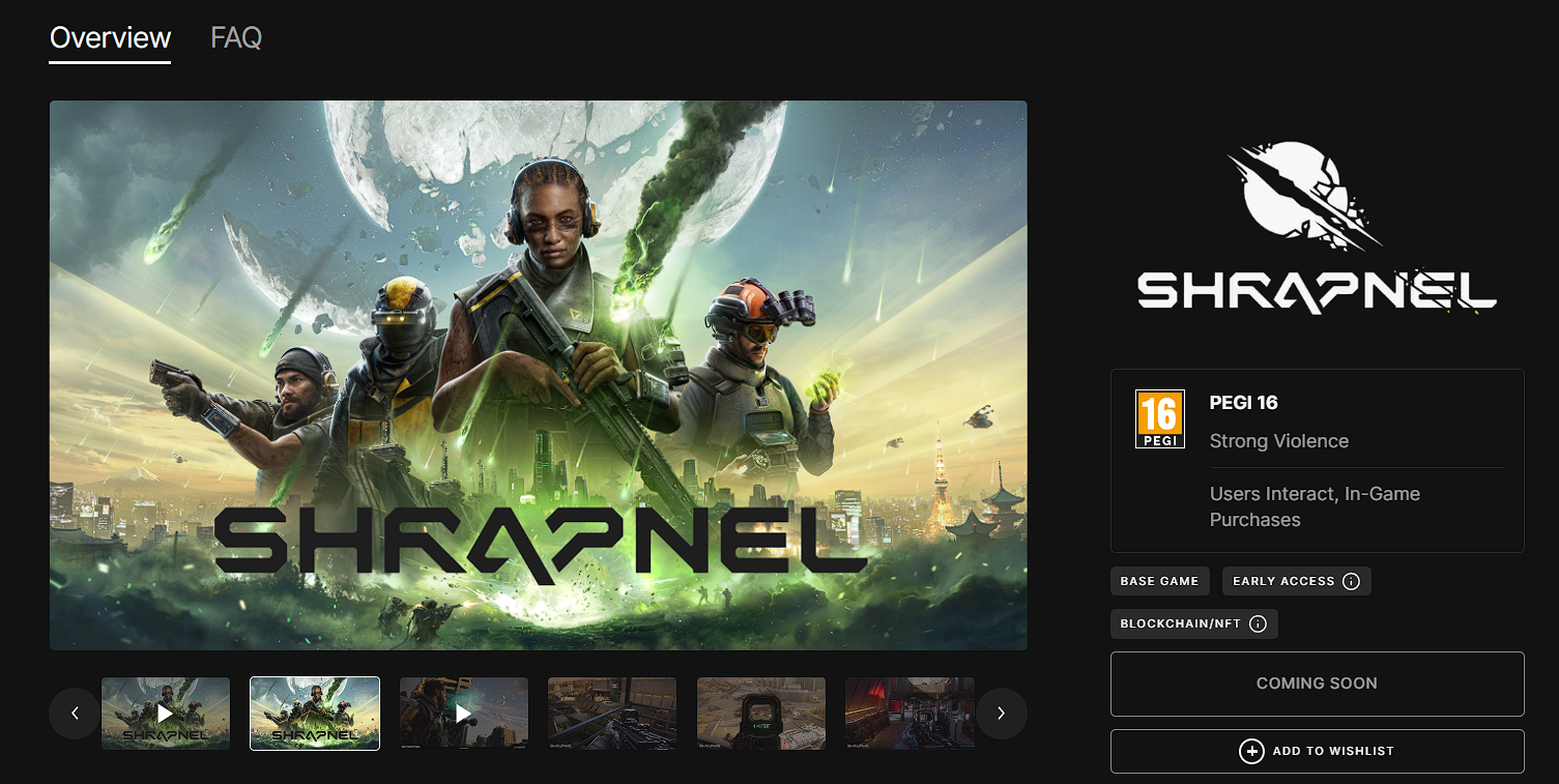Şuan itibariyle Epic Games’de Shrapnel’in sayfası da oluşturulmuş durumda. Blockchain/NFT etiketi ile yer alan Shrapnel, çok yakında erken erişim şekilde çıkış yapacak.