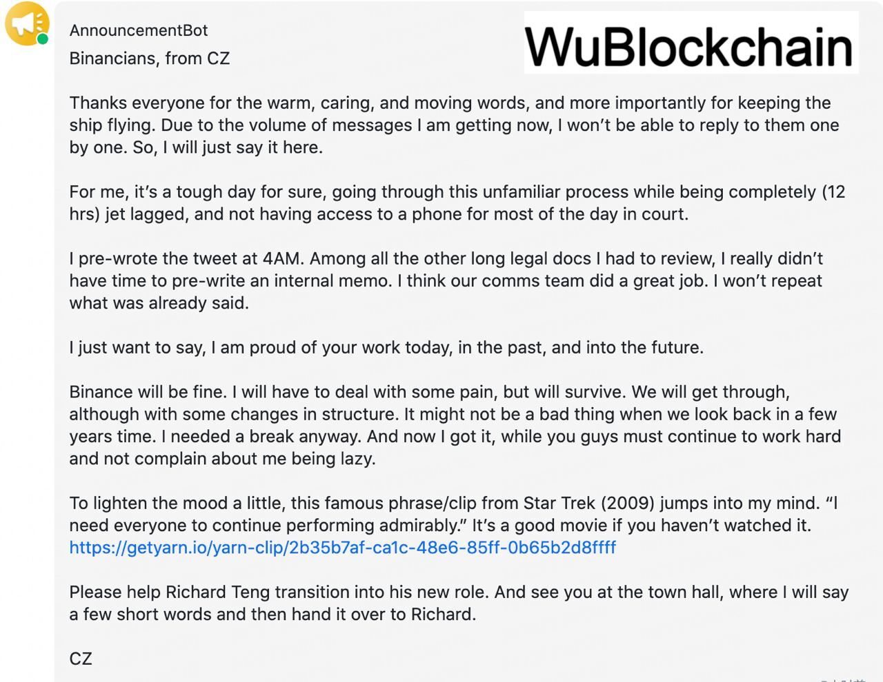Bugün itibariyle ise CZ’nin çalışanlarına gönderdiği mektup ortaya çıktı. Çin merkezli bir kripto gazetesi olan Wu Blockchain’in paylaştığı mektupta, şu sözler yer alıyor: