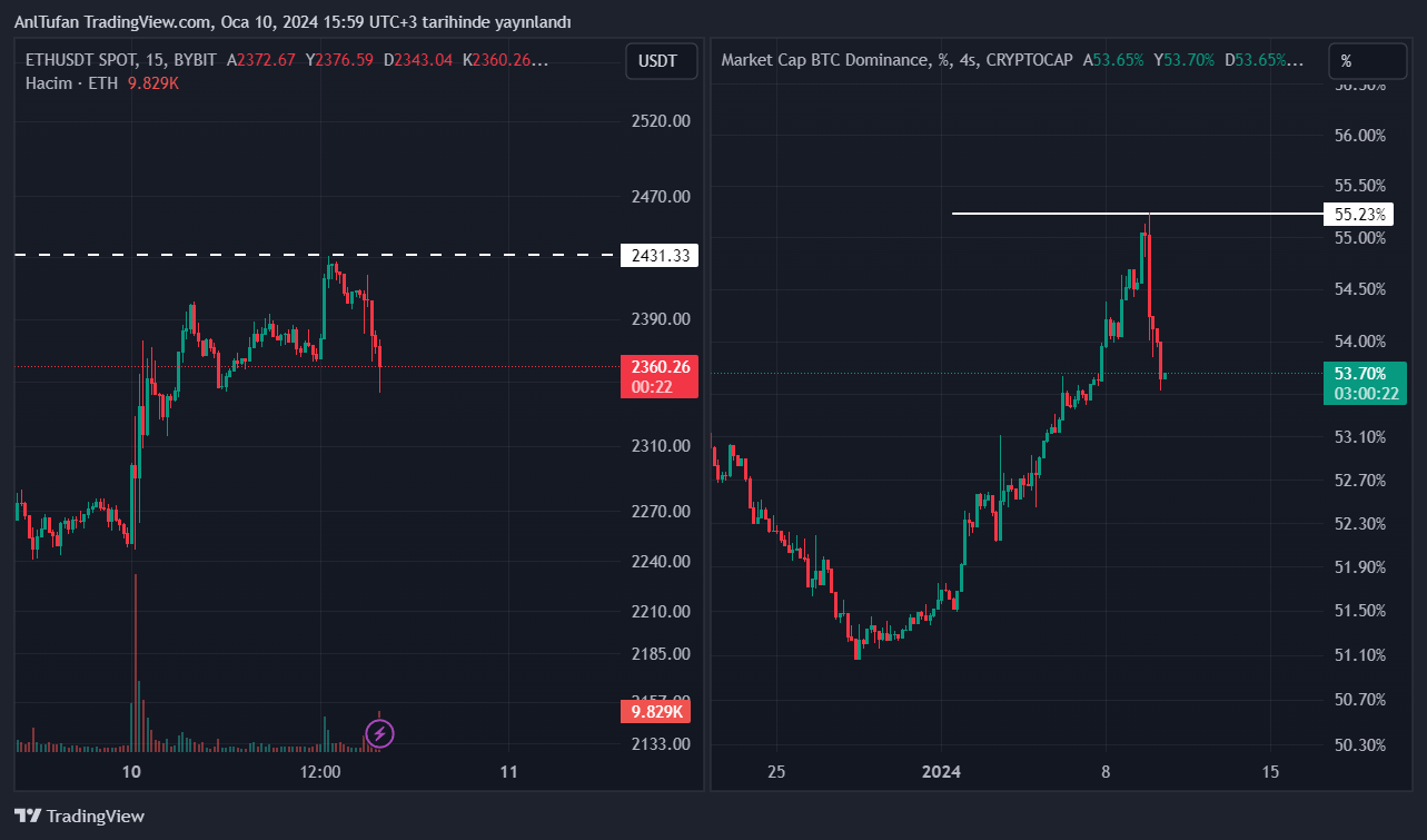Önümüzdeki saatlerde an itibariyle %53.7’li seviyelerde yer alan BTC hakimiyetinin yeniden %55’li seviyelere ulaşması, altcoin’lerdeki satış baskısını daha artırabilir.