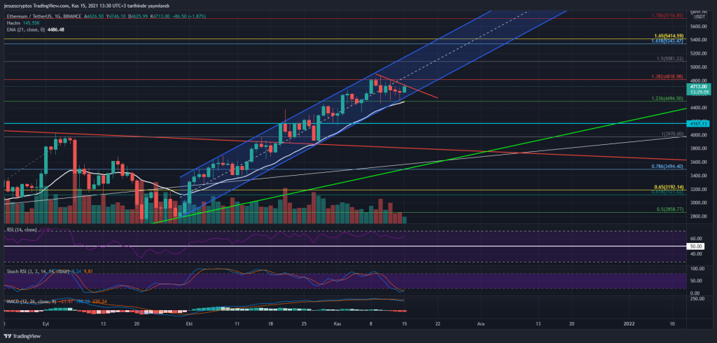 Bugünkü yükselişle bu düşüş trendinin direncini deneyen ETH’nin bu direnci kırmasıyla 4,818 dolarla karşı karşıya geleceği düşünülüyor. Yatay bir direnç olan bu seviyenin geçilmesi ise ETH’de yeni bir ATH olması beklenen ve psikolojik bir seviye olan 5,000 doların gelmesini sağlayabilir. Teknik olarak bu formasyonun bozulmaması halinde ETH’nin Kasım ayı içinde 5,000 doları bulması bekleniyor.