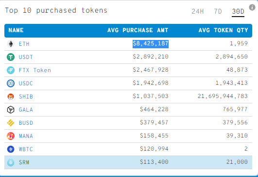 Büyük yatırımcıların (balina) kripto cüzdanlarını takip etme sitesi olan WhaleStats’tan alınan verilere göre, en büyük 1000 Ethereum balinasının son 30 gün içerisinde 8.42 milyon dolar değerinde ETH, 2.89 milyon değerinde stablecoin Tether (USDT) ve 2.46 milyon dolar değerinde FTX Token (FTT) satın aldığını gösteriyor.