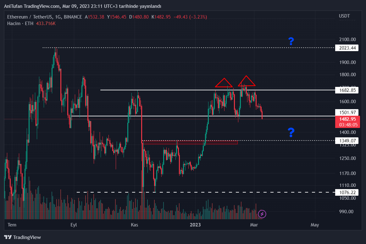 Her ne kadar lider altcoin 2023 yılına güzel başlamış olsa da, şuan itibariyle yaşadığı yükselişlerin önemli bir kısmını kaybetti. ETH’nin düşüş trendini sonlandırması için 1.500 dolar desteğini koruması gerekiyor.
