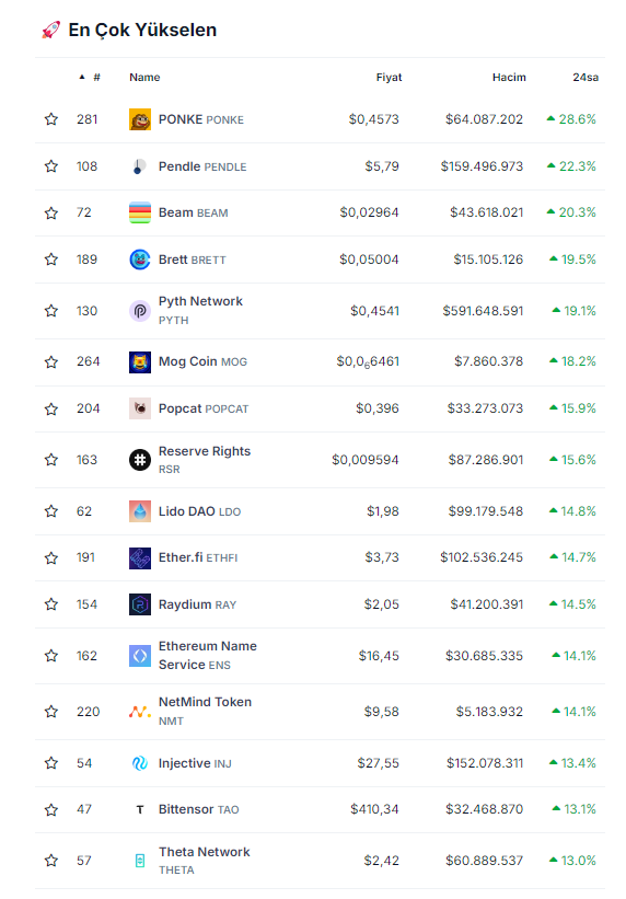 PONKE bugün özelinde %28 oranında yükseliş yaşarken, PENDLE, BEAM, BRETT, PYTH ve MOG‘un da %15’den fazla değer kazandığı gözlemlendi.