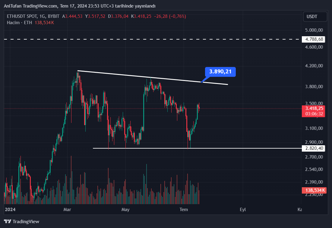 Ethereum şuan itibariyle 3.400 – 3.500 dolar aralığında akümüle olsa da, önümüzdeki günlerde tekrardan yukarı yönlü bir atak yapması bekleniyor.