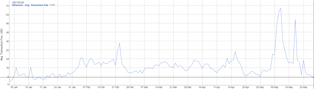 Ağdaki arz talebe göre değişen bu ücret, talebin arttığı 12 Mayıs günü zirve seviye olan 69.922 dolar seviyesine ulaşarak ETH fiyatıyla beraber rekor seviyeye ulaştı. ETH fiyatının düşüşe geçmesiyle artan satış baskısı ve talebin azalmasıyla ağ ücretleri de hızla düşüşe geçti.