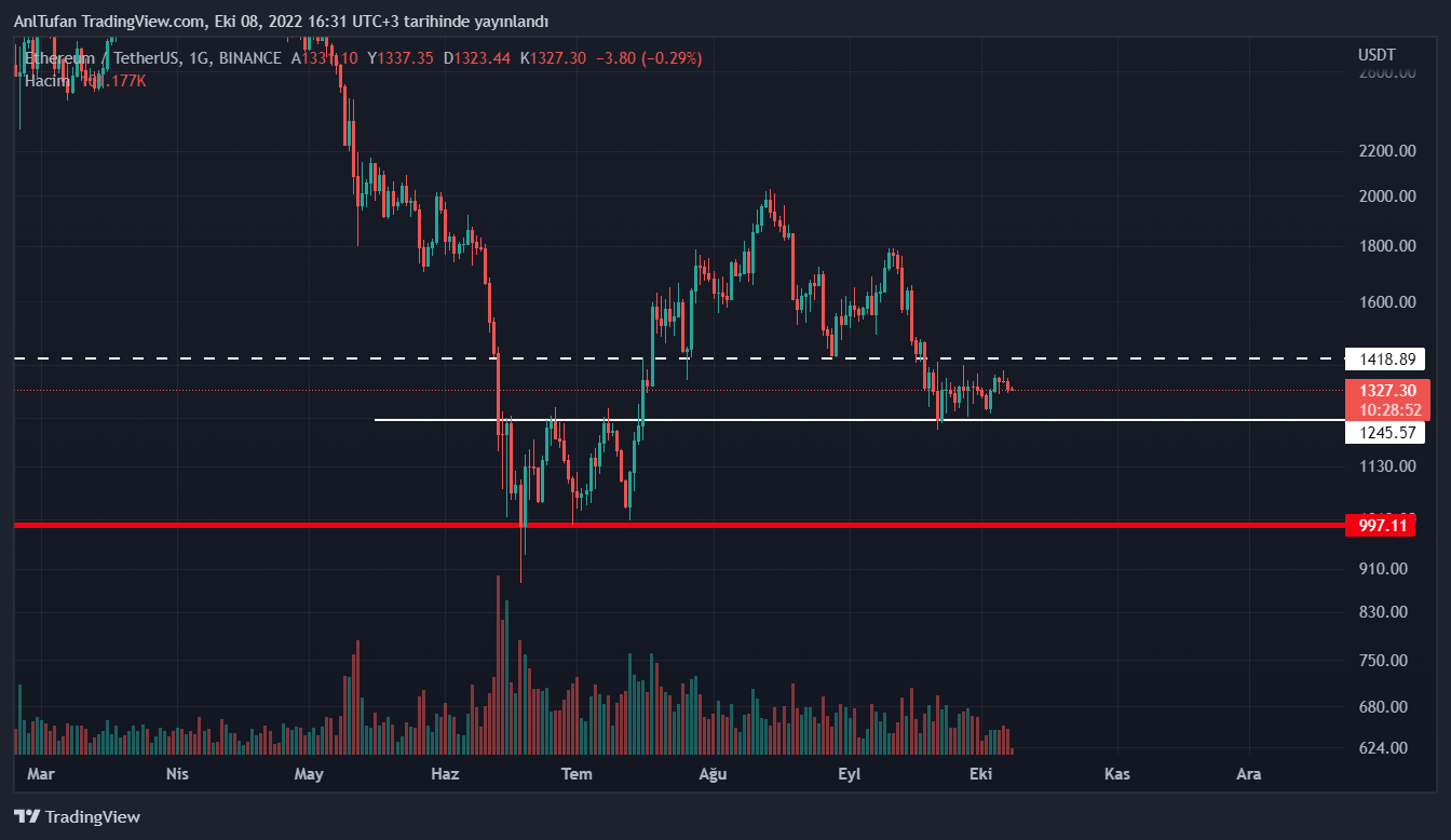 18 Eylül tarihinden bu yana 1.240 – 1.420 dolar aralığına sıkışan Ethereum, yüzde 12’lik bir bölgede yukarı aşağı hareketler sergilediği gözlenmekte.