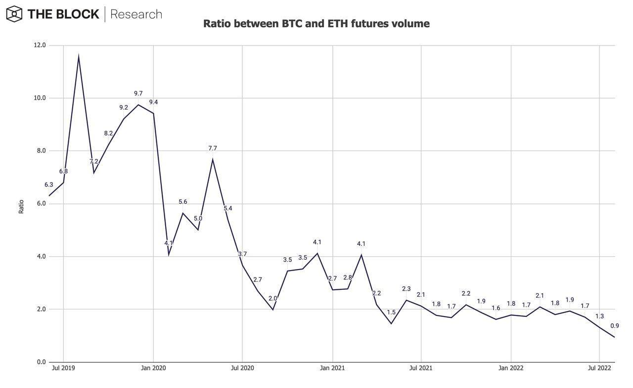The Block Research’ün paylaştığı verilere göre, Ethereum’un vadeli işlemlerdeki hacmi tarihte ilk kez Bitcoin‘i (BTC) geçmeyi başardı.