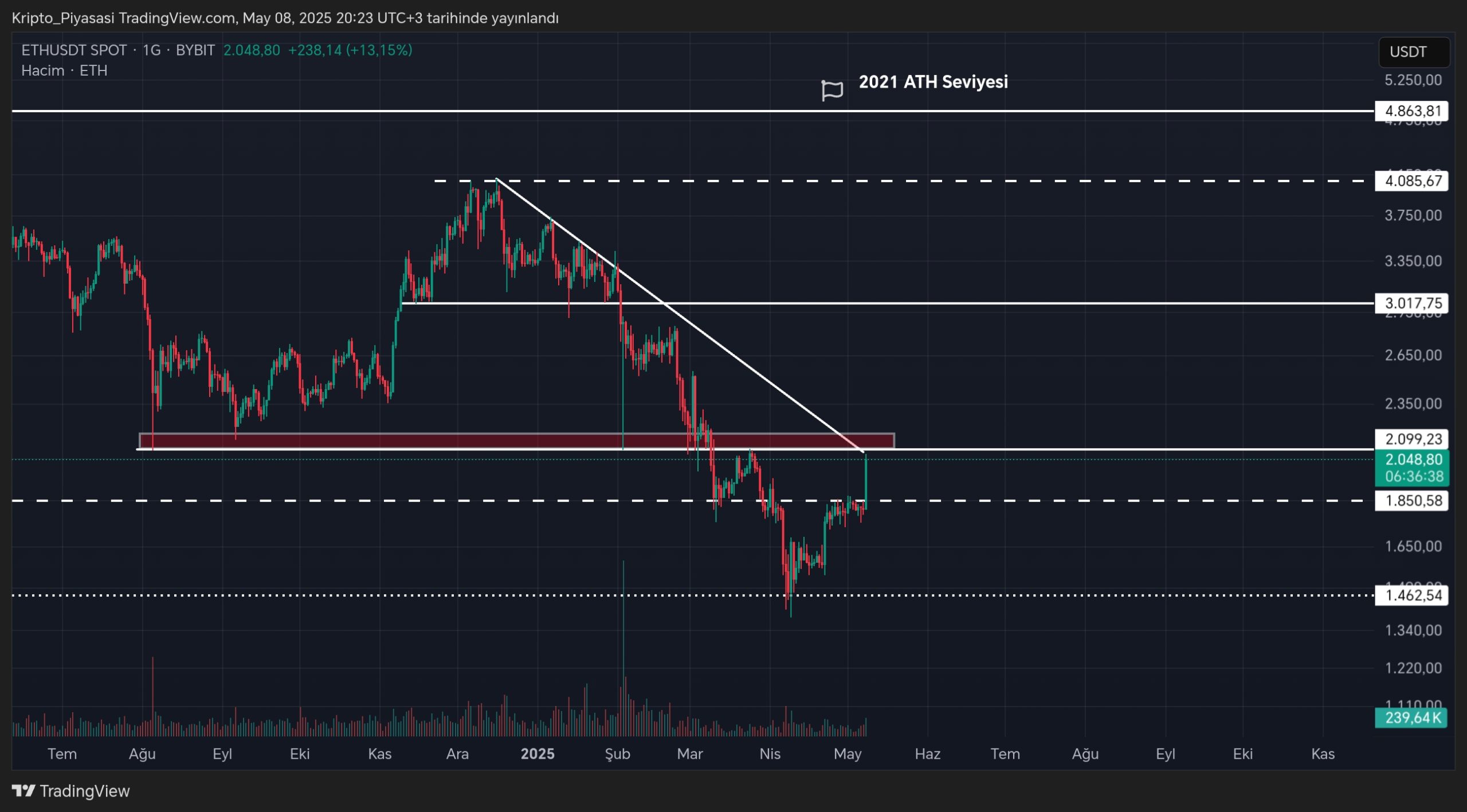 İlerleyen günlerde Ethereum’un (ETH) 2.100 – 2.200 dolar aralığındaki direnç bölgesini hacimli bir şekilde kırmayı başarması, ETH’deki yükselişlerin daha da alevlenmesini sağlayacaktır.