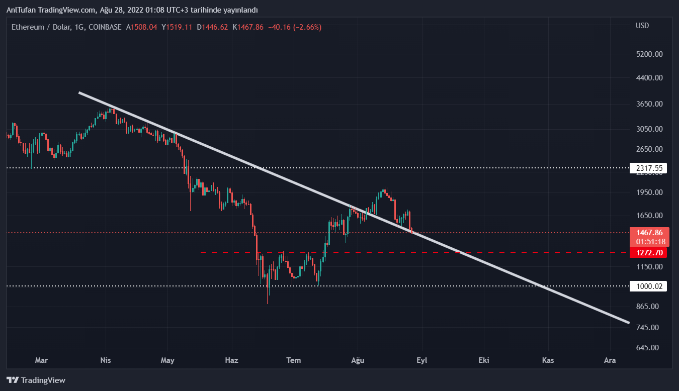 Geçtiğimiz süreçte yaşadığı yükselişler ile birlikte kırdığı düşen trendine bir retest hareketi gerçekleştirdiği görülen ETH, ilerleyen günlerde 1450 dolar desteğini kaybetmediği sürece yükselişlerine devam edebilir.
