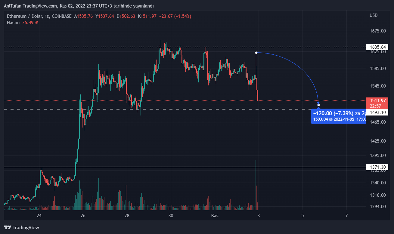 1.620 dolar noktasından 1.500 dolar seviyelerine kadar çöküş yaşayan ETH, sadece 3 saat içerisinde yüzde 8’e yakın değer kaybettiği görüldü.