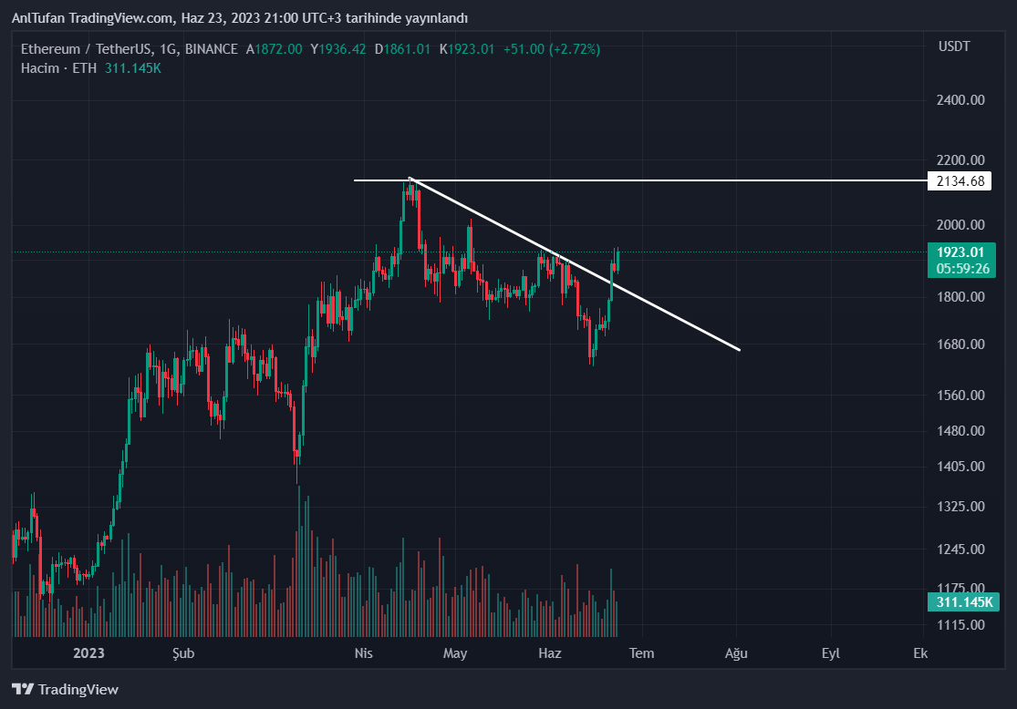 Şuan itibariyle Ethereum’un (ETH) ilk hedef seviyesinin, son zirve noktası olan 2.135 dolar olduğu görülüyor. Bitcoin her ne kadar son zirve noktası olan 31 bin doları aşmayı başarsa da, ETH son zirve noktasına dahi yükselemedi.