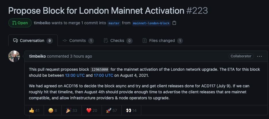 Ethereum’un önde gelen geliştiricilerinden Tim Beiko, konu hakkında yayınladığı gönderide güncellemenin 4 Ağustos 2021 tarihinde yapılabileceğini vurguladı. Bunun tahmini bir saat ve tarih olduğu uyarısı da paylaşıldı. Normal şartlarda temmuz ayında gerçekleştirilmesi planlanan London hard forku, blok hızındaki yavaşlamadan dolayı Ağustos ayına sarkmış olabilir.