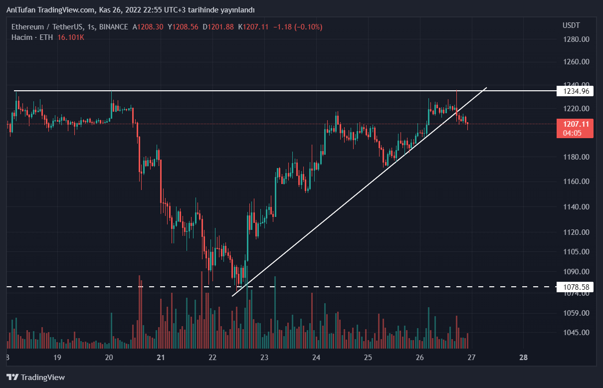 1.073 dolar destek noktasından yüzde 15’e yakın yükseliş yaşayan ETH, geçtiğimiz saatlerde 1.234 dolar direncine iğne atmış olsa da, bu noktayı kırmayı başaramamış durumda.