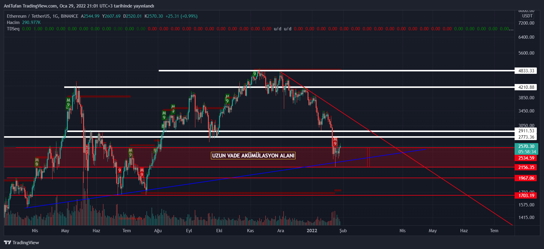 2200 – 2500 dolar uzun vadeli akümülasyon alanının altında günlük kapanışlar yapması durumunda 1900 dolar ara desteğine kadar gerileyebilecek olan ETH, bu destek seviyesinde de tutunamaması durumunda, 1700 dolar desteğine kadar geri çekilme yaşayabilir.