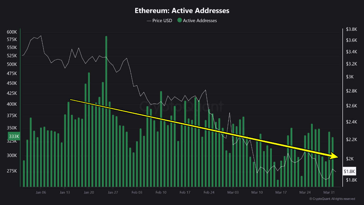 - On-chain veriler, Ethereum’un devam eden fiyat düşüşünün başlıca nedenlerinden birinin düşük ağ aktivitesi olduğunu gösteriyor. Yılın başından bu yana aktif adres sayısı istikrarlı bir şekilde azalıyor ve blok başına ortalama ücretler rekor düşük seviyelere geriledi.