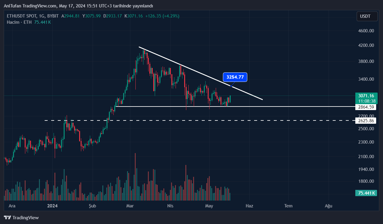 Son 24 saat içerisinde %5’e yakın bir artış yaşayarak 3.070 dolar seviyelerine ulaşan Ethereum (ETH), 2.864 doları net bir destek haline çevirmiş gibi gözüküyor.