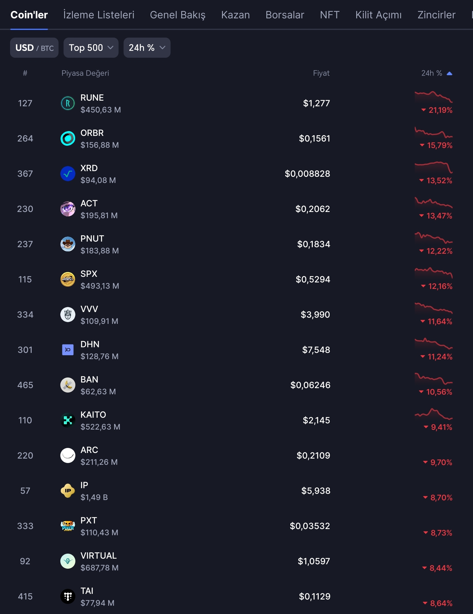 Başarılı bir analitik şirketi olan CoinMarketCap’in verilerine göre ilk 500 kripto para birimi içerisinde son 24 saat özelinde en büyük düşüşü -%21 ile birlikte RUNE isimli altcoin gerçekleştirdi.