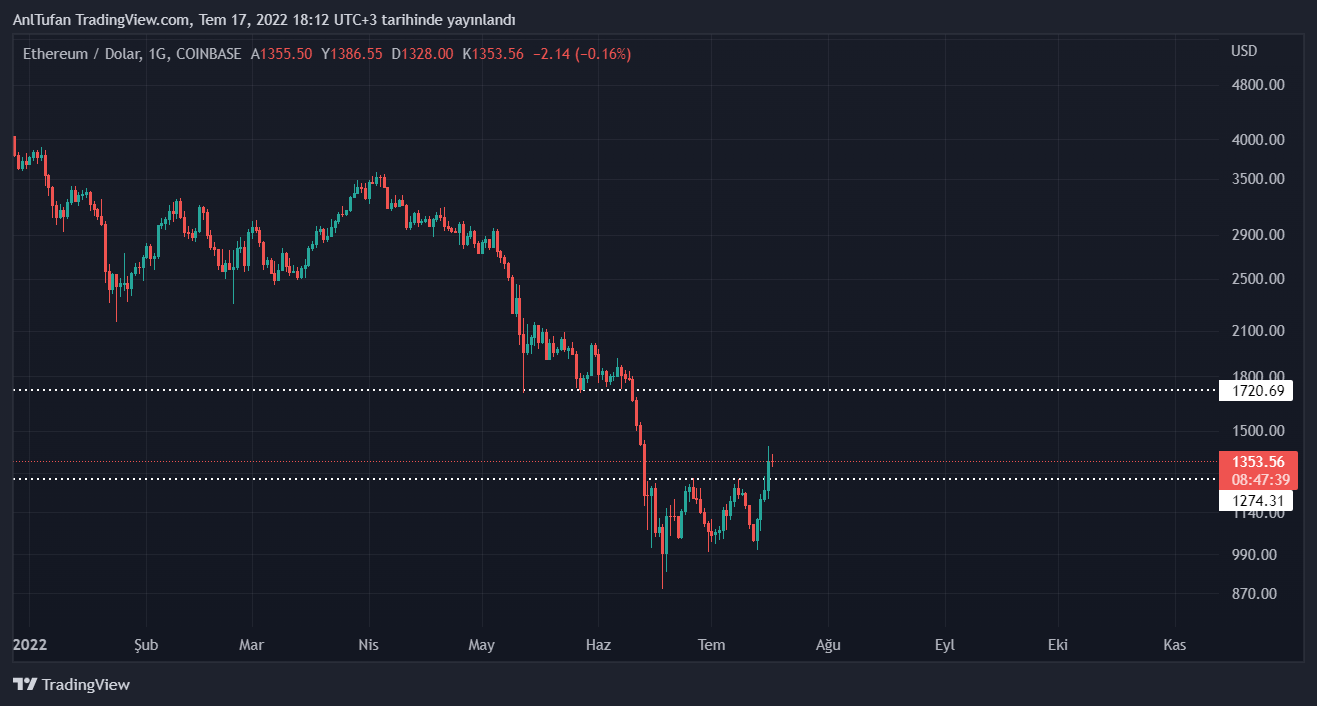 Bu hafta itibariyle CoinMarketCap’in aktardıklarına göre en sert yükseliş yaşayan ilk 2 kripto para biriminden bir tanesi olan Ethereum, an itibariyle 1355 dolar seviyelerinden işlem görmekte.