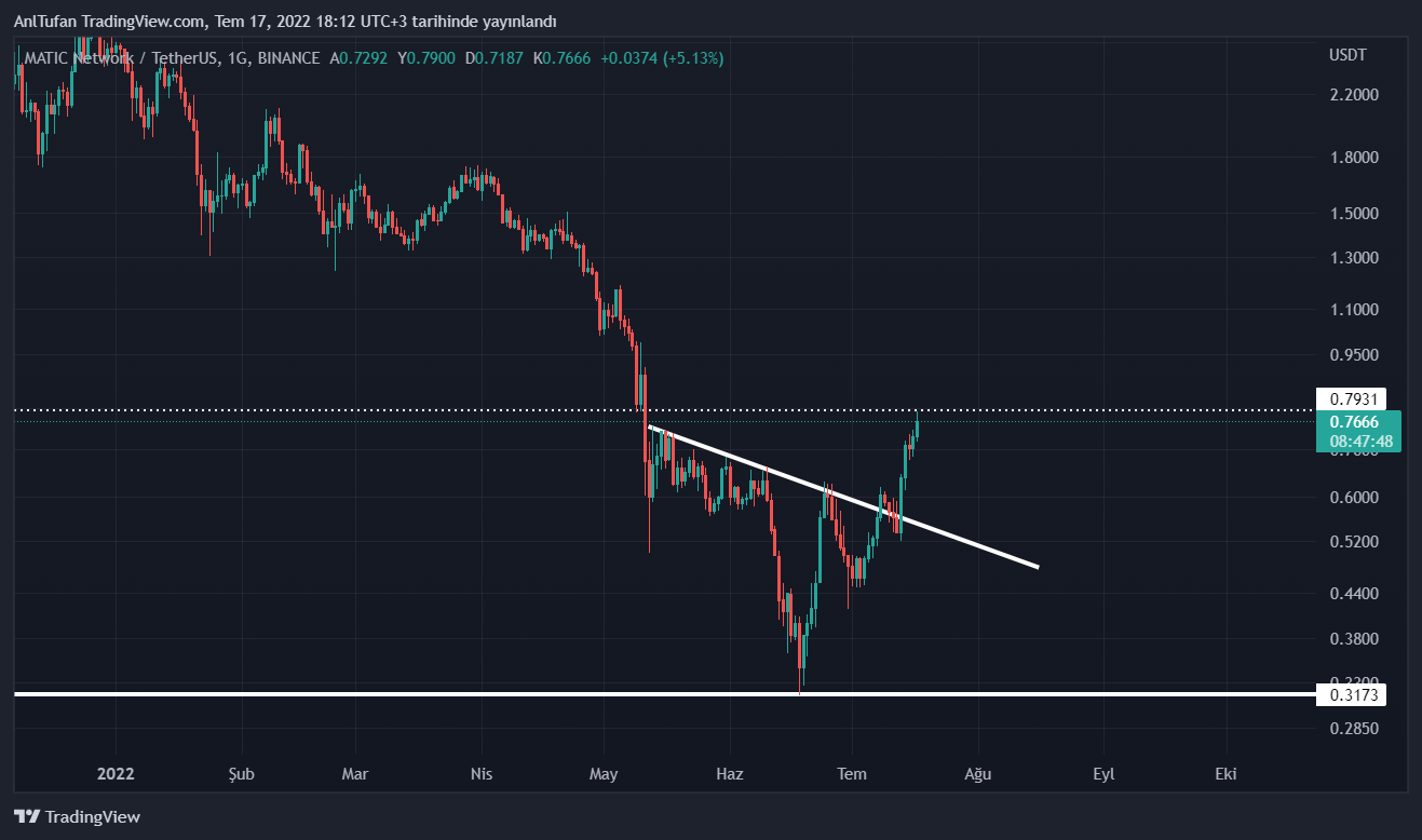 MATIC‘in yükselişlerine devam edebilmesi için 0.80 doları aşması gerekmekte. Bu direncin aşılması popüler altcoini 1 dolara ulaştırabileceği gibi aşılamaması 0.65 dolara bir düşüş yaşanmasına neden olabilir.
