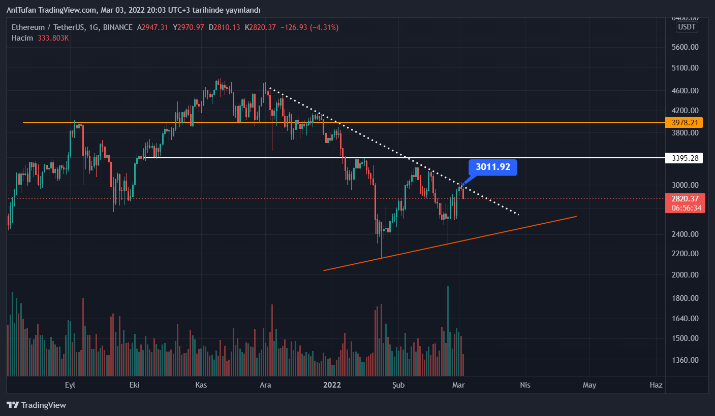 FED açıklaması gelmeden önce düşen trendini kırmayı deneyen Ethereum, 6. defa bu trend çizgisinden satış yemeye devam ediyor. Ethereum’un fiyatı 3000 dolar seviyelerine geldiğinde kripto para yatırımcıları satmaya devam ediyor.