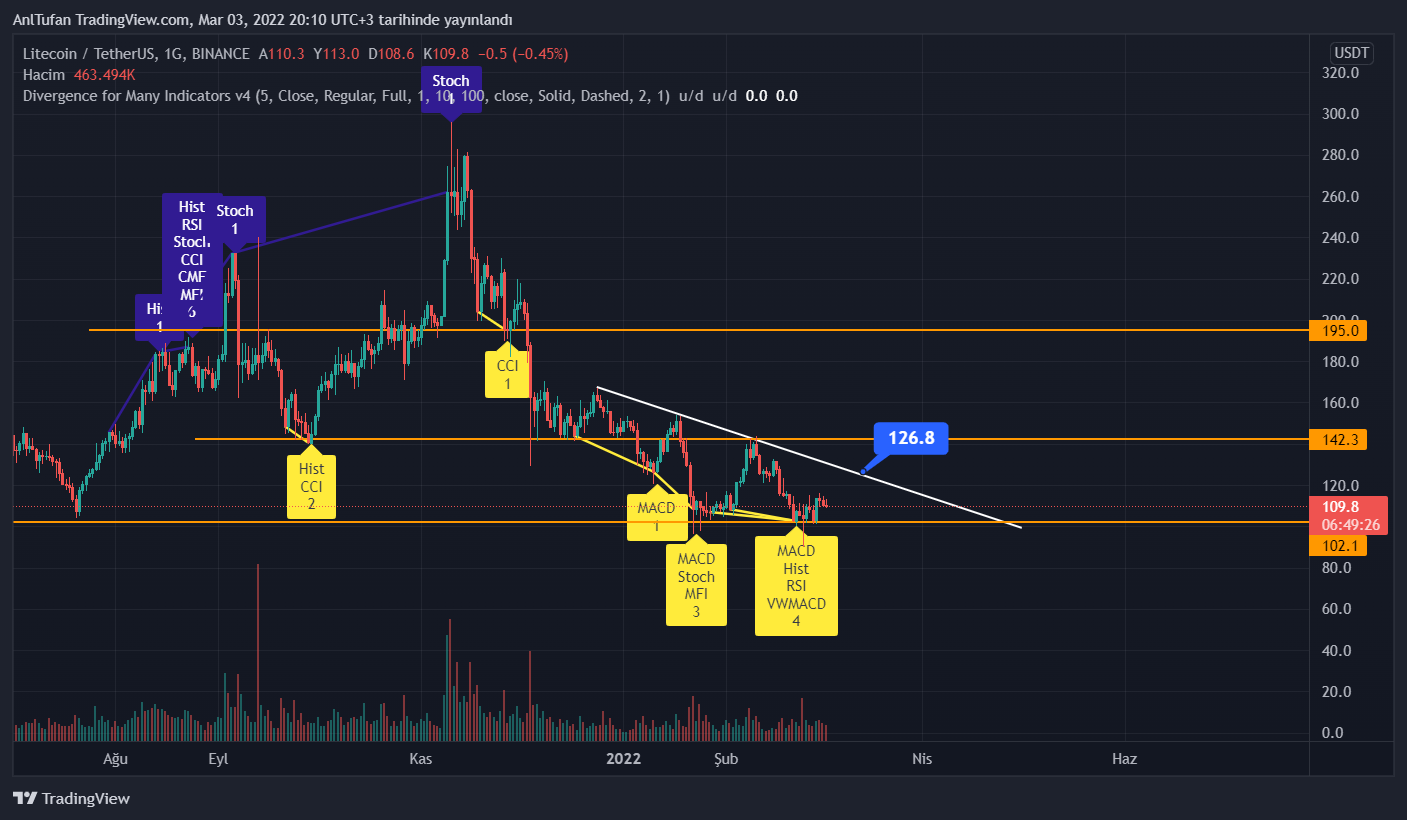 100 dolar major desteğinin üzerinde bulunan Litecoin’de, 4 tane indikatör geçtiğimiz günlerde pozitif uyumsuzluk veriyordu. Bu uyumsuzluklar doğrultusunda 115 dolara kadar yükselen LTC, satış baskısı yemeye devam ediyor.