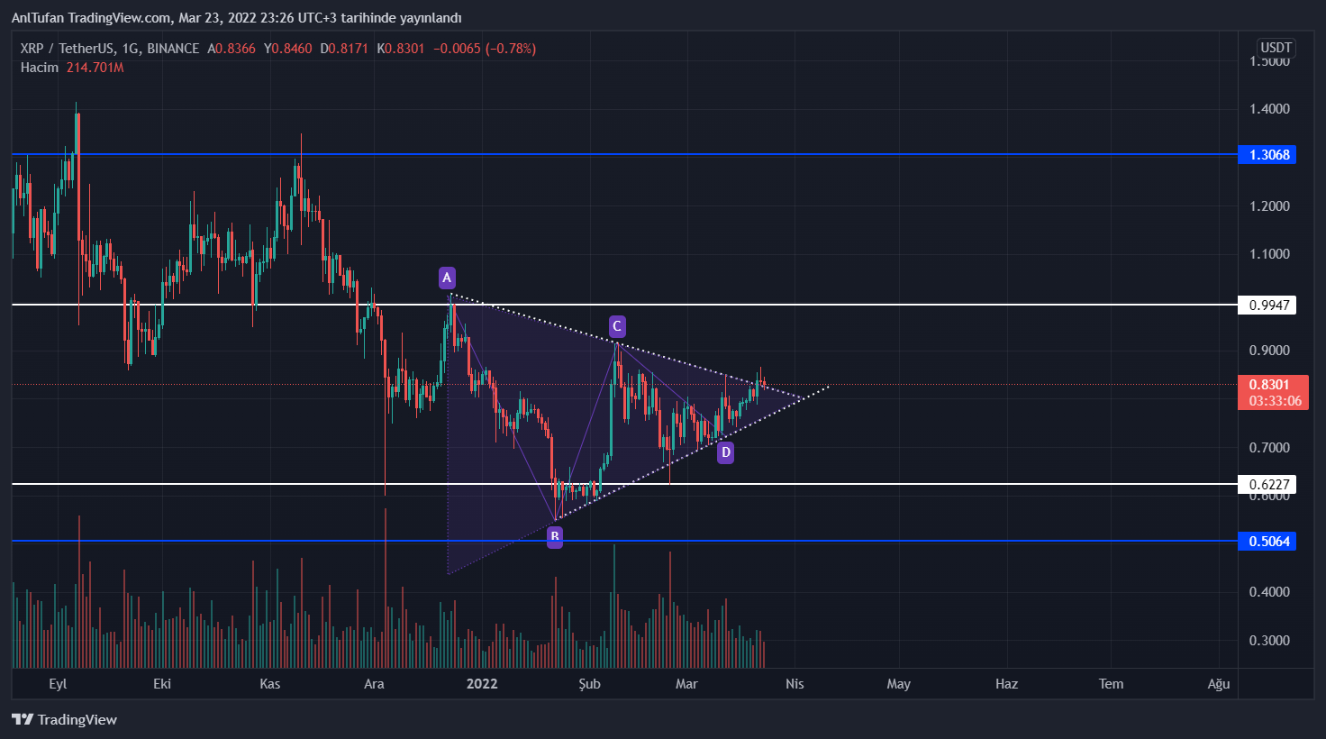 Haberimizin yazıldığı esnada 0.83 dolar seviyelerinde bulunan XRP, simetrik üçgen formasyonun halen üzerinde konumlanıyor.