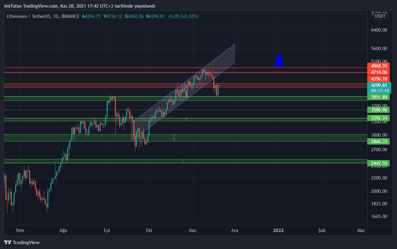 4.356 dolar direnç seviyesi üzerinde günlük kapanış yapması çok kritik olan ETH, bu seviyenin kırılmasıyla önce 4.700 doları, ardından ise 4.900 dolar seviyelerini hedefleyecek gibi duruyor.