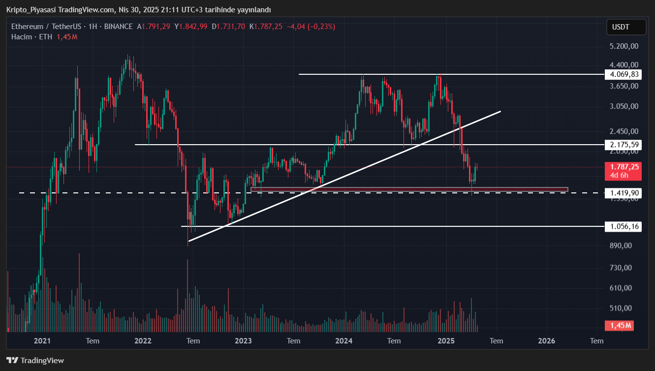 Ethereum (ETH) haberimizin yazıldığı esnada 1.785 dolar seviyelerinden işlem görüyor. Bir süredir ara direnç seviyesi olan 1.850 dolar doları zorlayan ETH, bir türlü bu direnci aşamadı.