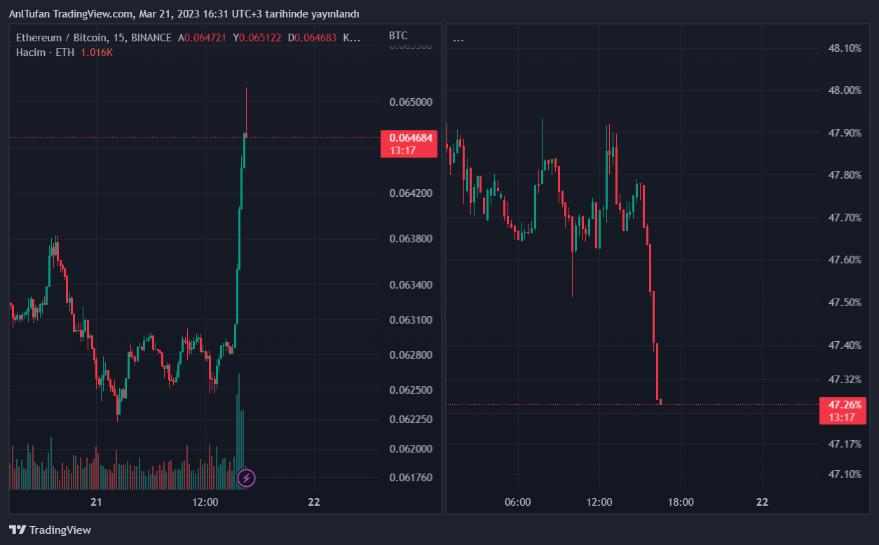 Şuan itibariyle Ethereum/Bitcoin paritesinin hareketlerini incelediğimizde, ETH’nin kayda değer bir sıçrama yaptığı görülmekte. Bu sıçrama kısa vadede altcoin’leri olumlu etkiledi.
