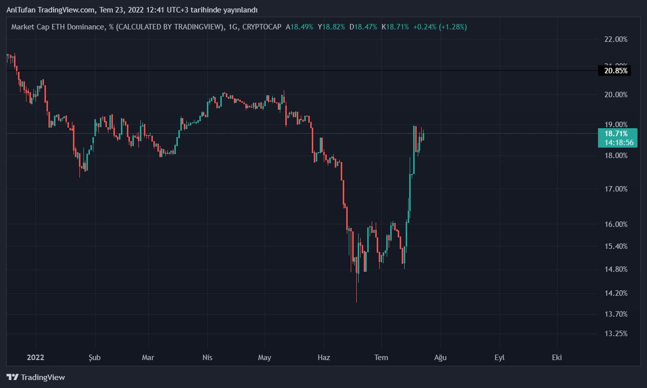 Bu yaşanan yükselişlerin sonucunda ise yüzde 14 seviyelerinde bulunan Ethereum dominance tablosu, kısa bir süre içerisinde yüzde 19 seviyelerine kadar yükseliş yaşadığı dikkat çekti.