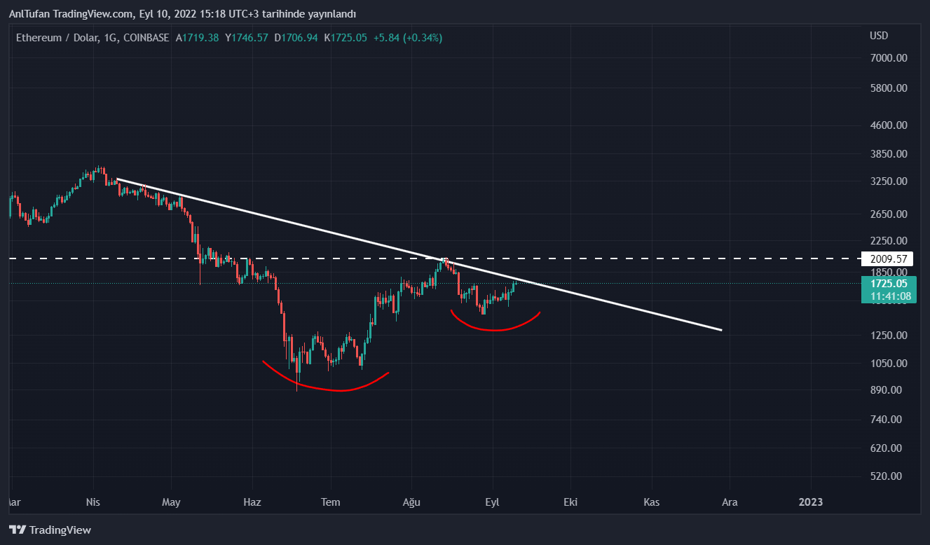 Lider altcoin kritik direnç noktasına ulaştığında bir trend dönüşüm paterni olan çanak kulp formasyonu oluşturmayı başaracak. Ayıların ise bu formasyonun çalışmaması için 2000 doları savunması gerekmekte.