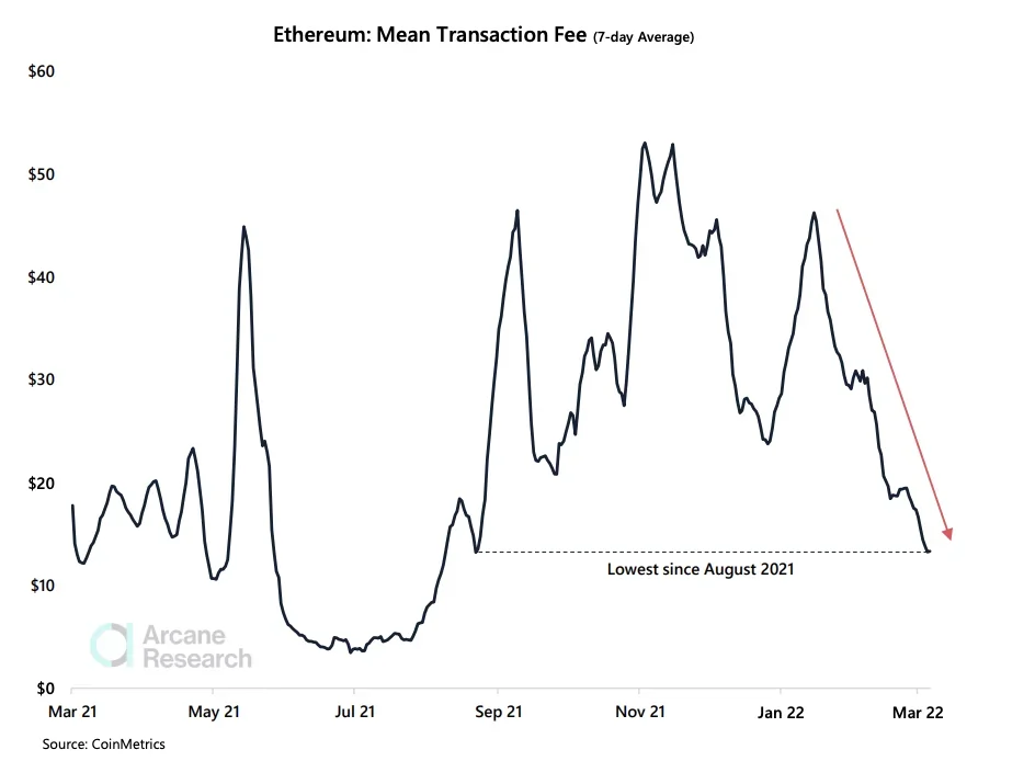 Arcane, CoinMetrics verilerinden yola çıkarak Ethereum işlem ücretlerinin yedi günlük ortalamasının, geçen yılın ağustos ayından bu yana en düşük oranda olduğunu duyurdu.