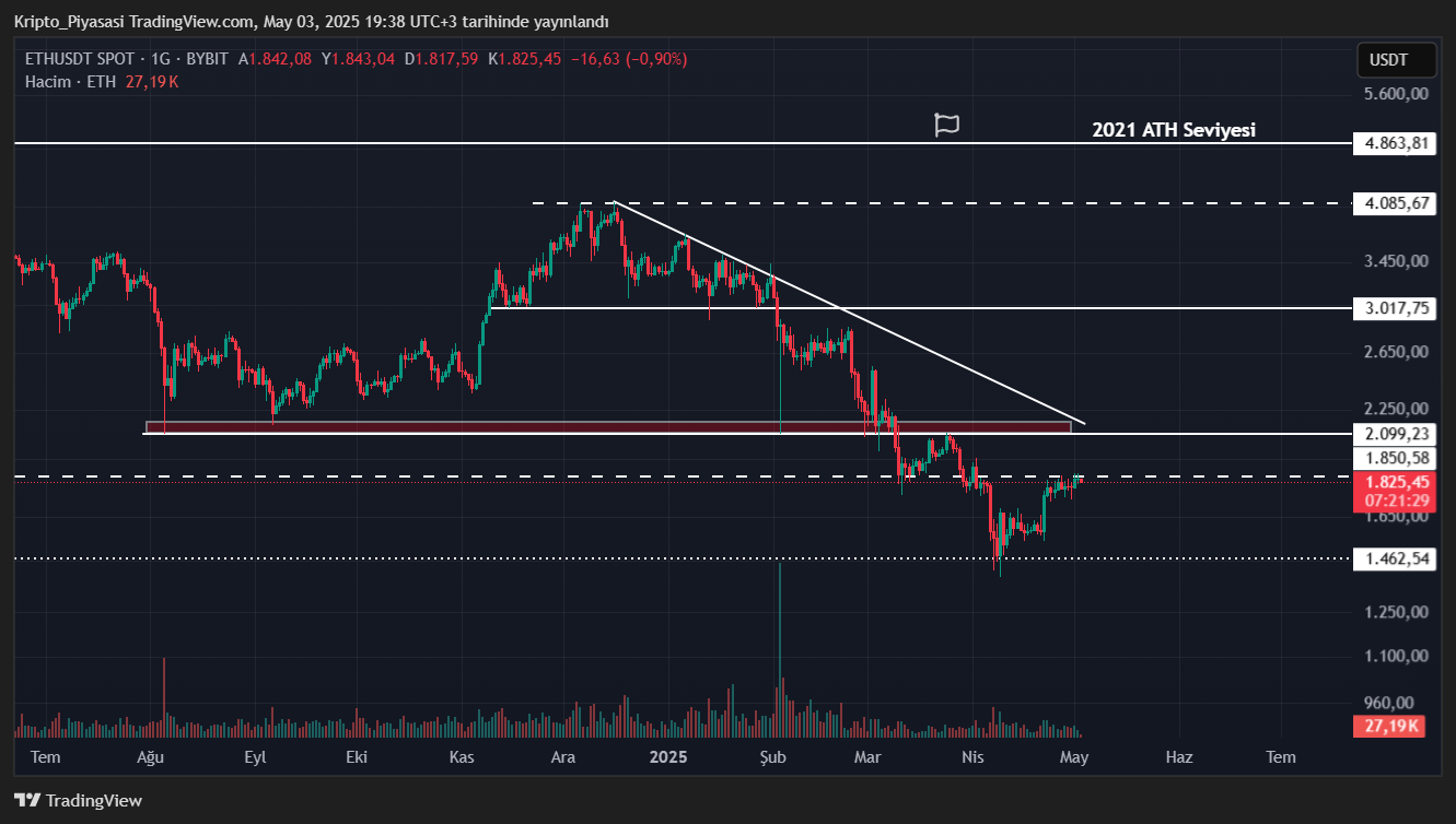 Her ne kadar Ethereum (ETH) son dönemde kayda değer bir toparlanma yaşamış olsa da, daha ilk direnç noktasını aşmayı başaramadı. ETH 1.850 dolar direncini aşması durumunda 2.100 dolar direnç bölgesini test edecek.