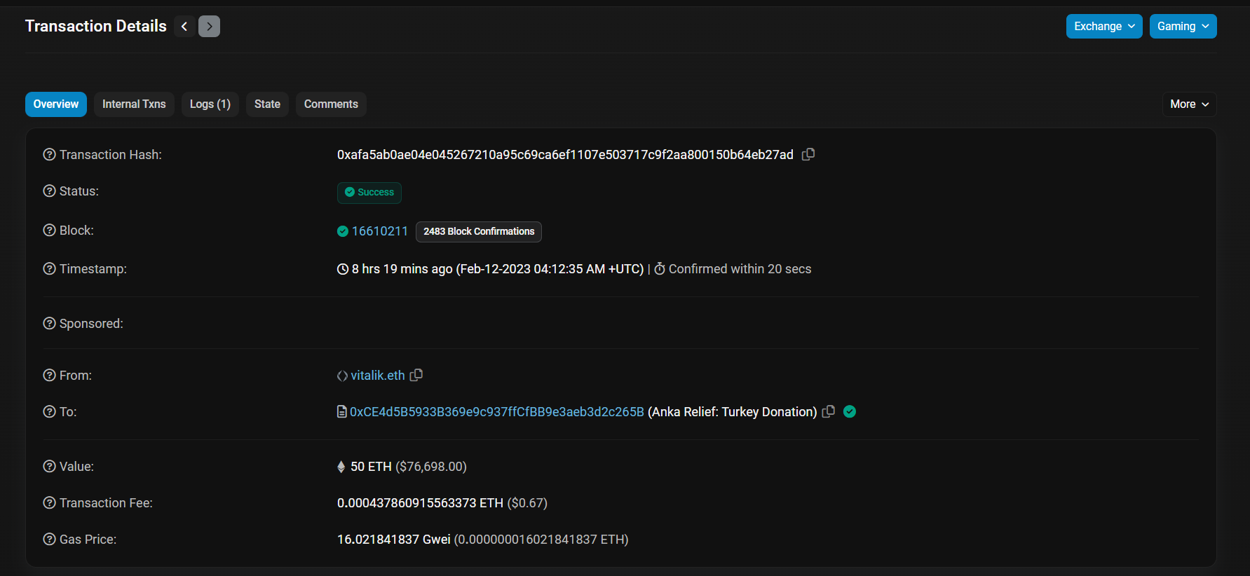 Bugün itibariyle ise Vitalik Buterin’in 50 ETH’lik bir bağış daha yaptığı görüldü. Bu sefer Ahbap Vakfından ziyade Anka Yardım Vakfına bağış yapan Buterin, yine dikkat çekti.