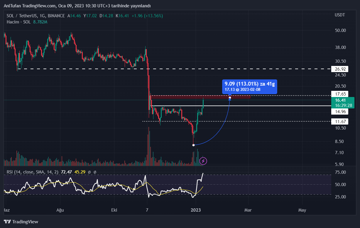 Bugün itibariyle Solana’nın 14.96 dolar kritik direnç seviyesini aştığı görüldü. Bu direncin kırılımı ile birlikte kısa bir süre içerisinde yüzde 15’den fazla değer kazanan SOL, şuan itibariyle kritik bir direnç seviyesi olan 17.65 dolara ulaşmış durumda.