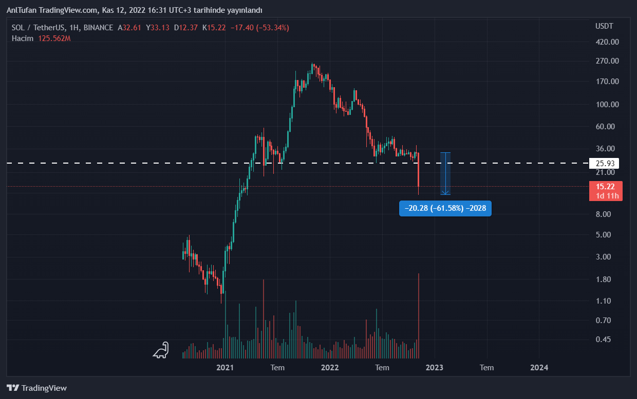 Her ne kadar Solana FTX token (FTT) gibi yüzde 90’dan fazla değer kaybetmemiş olsa da, bu hafta özelinde yüzde 60’dan fazla düşüş yaşadı.