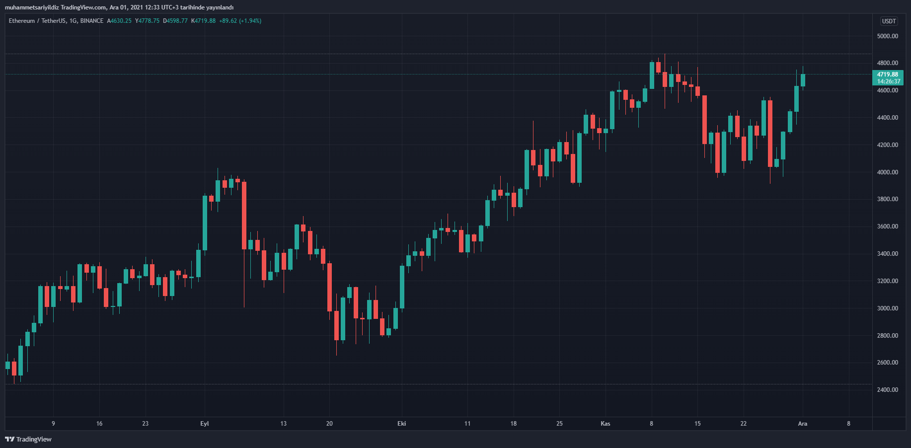 Haberimizin yazımı sırasında, Ethereum’un fiyatı son yedi günde %10 artışla 4.700 dolar civarında dalgalanıyor.