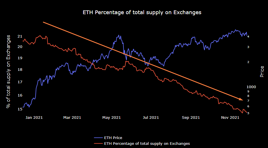 Yukarıdaki grafikte görebileceğiniz gibi borsalardaki ETH arzı yüzdesi şimdiye kadar tüm yıl boyunca sabit bir düşüş eğilimi gösterdi.