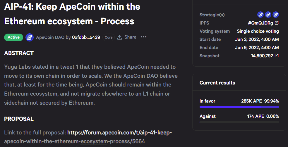 Oylamanın önerisinin yanı sıra, topluluk Ethereum‘dan başka bir zincire geçme taraftarı değil. Şu anda, tüm seçmenlerin %99’u, fonlarını ETH zincirinde tutmak istiyor.