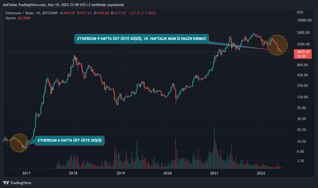 Tarihi boyunca en fazla 6 hafta düşüş yaşayan Ethereum, son dönemlerde ise 9 hafta üst üste değer kaybetmiş durumda. Şuan itibariyle 10. haftalık mumda kırmızı gözükürken, pazar gününe kadar net bir yükseliş gelmesi beklenmemekte.