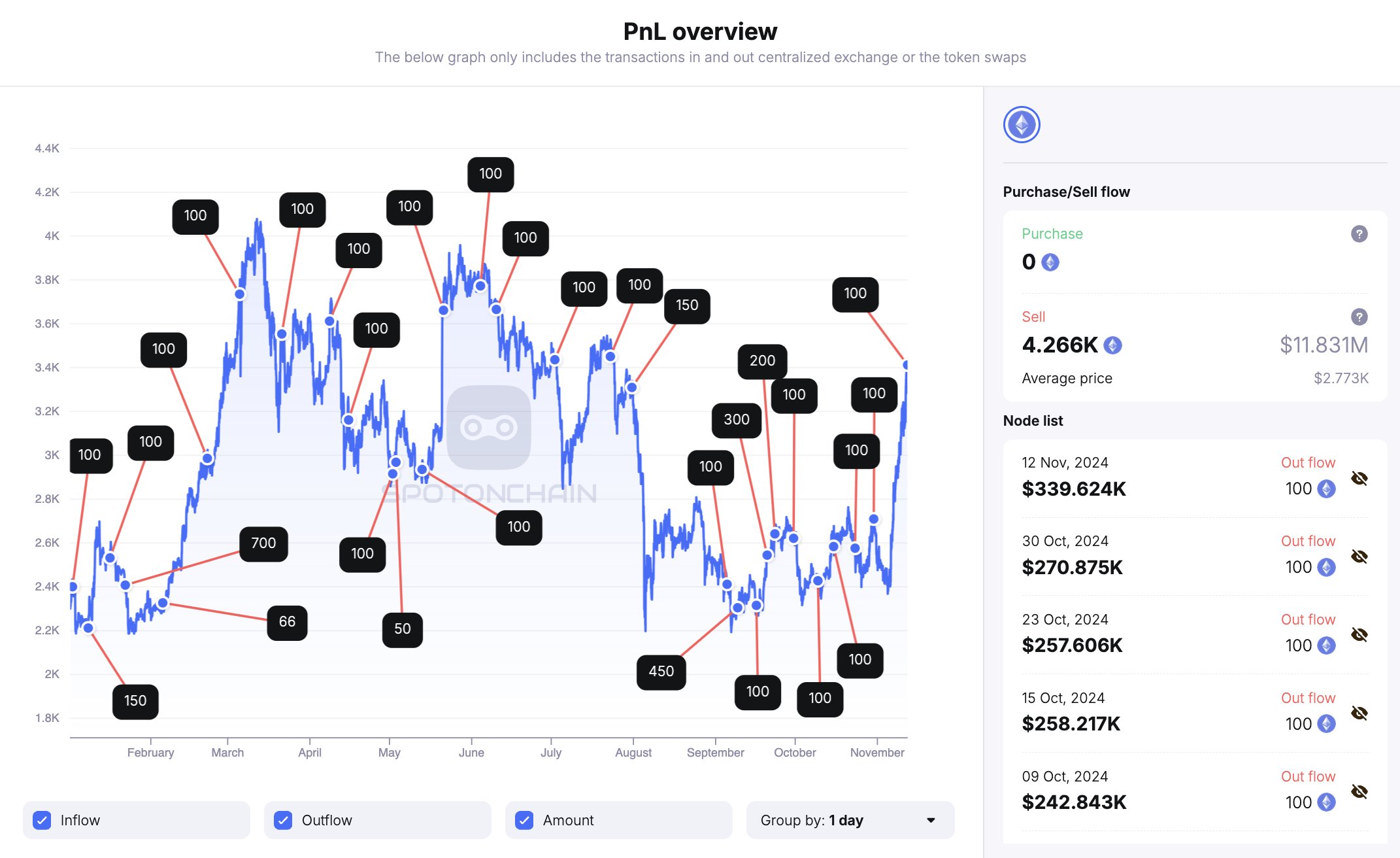 Ethereum Vakfı ise bu son yükselişler esnasında ETH satışları yapmaya devam ediyor. Zincir içi veri sağlayıcısı Spot On-Chain, Ethereum Vakfının son satışı hakkında şu bilgileri aktardı:
