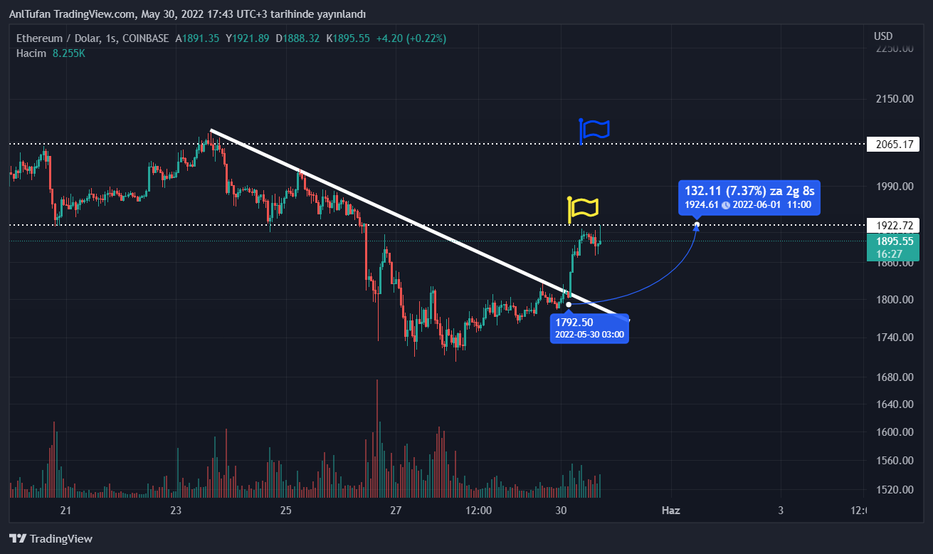 Haberimizin yazıldığı esnada 1905 dolar seviyelerinden işlem gören ETH, ilk hedef seviyesine ulaşmış durumda.