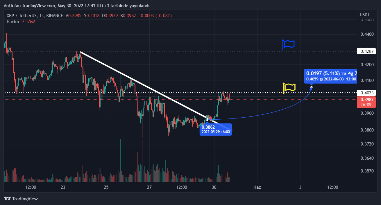 XRP‘nin ilerleyen saatlerde 0.402 dolar direncini kırması yükselişinin devam ettirmesi anlamını taşırken, bu direnç seviyesinden reddedilmesi için 0.3862 dolar seviyesine düşmesine neden olabilir.