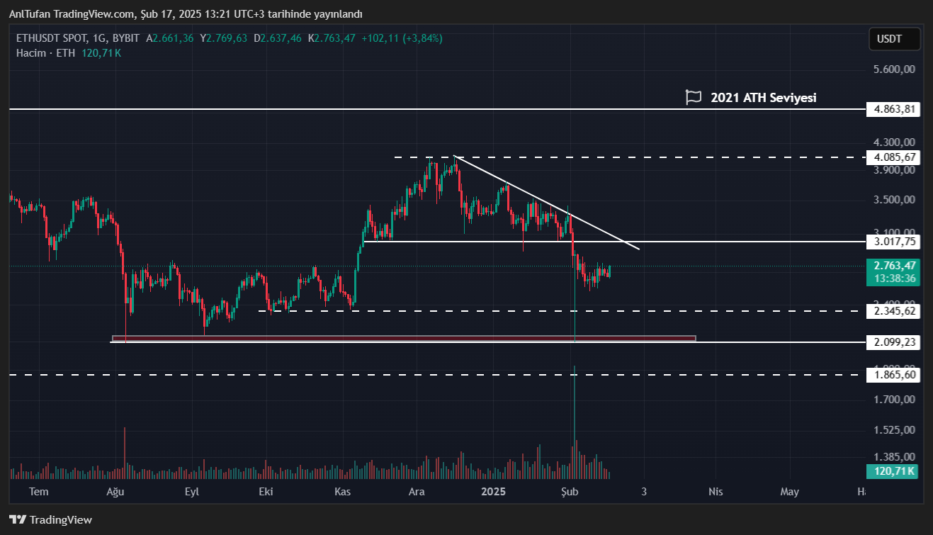 Ethereum’da (ETH) direncin aşılamaması ve yeni düşüşlerin meydana gelmesi halinde sırasıyla $2.600, $2.345 ve $2.100 destekleri takip edilecek.
